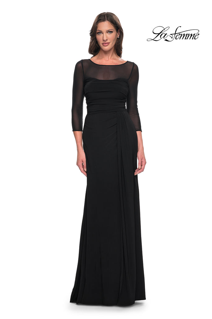 Long chic evening dress with illusion neckline and three quarter sleeves. Ruching on the bodice and draped detail on the skirt. Back zipper closure.