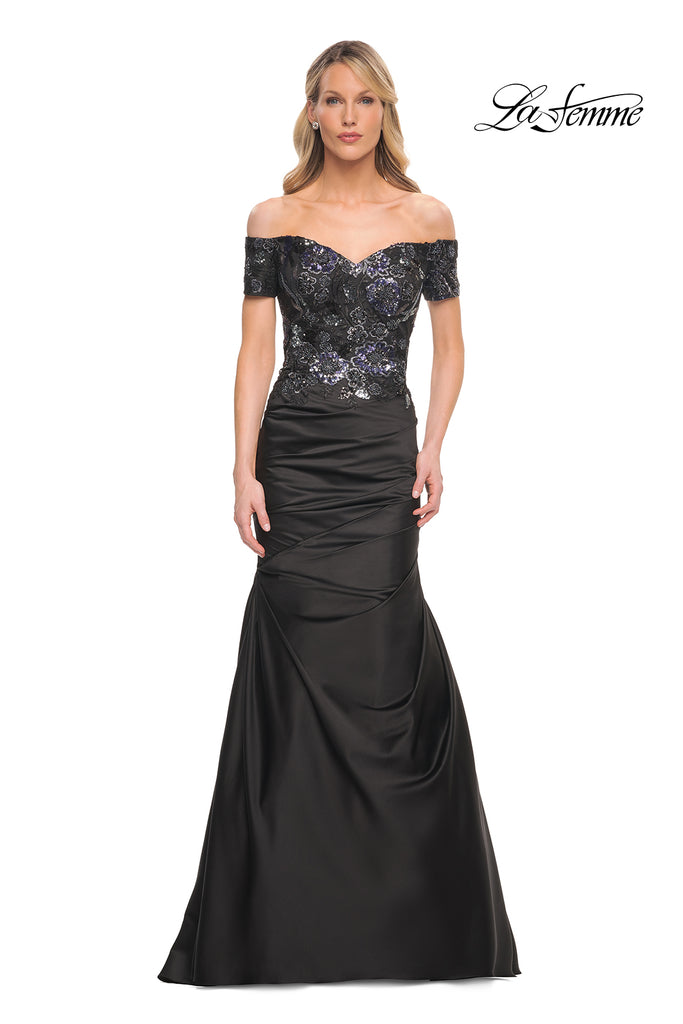 Satin mermaid gown with pleating throughout skirt. Off the shoulder top features a gorgeous beaded and sequin design. Back zipper closure.