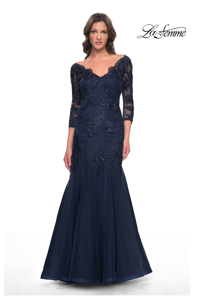 Mermaid mother of the bride dress with beautiful lace applique detail and scalloped neckline. Illusion three quarter sleeves. Back zipper closure.