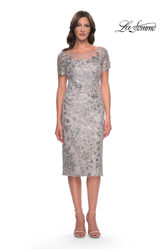 Short lace sequin dress with illusion neckline and beading along the top. Back zipper closure.
