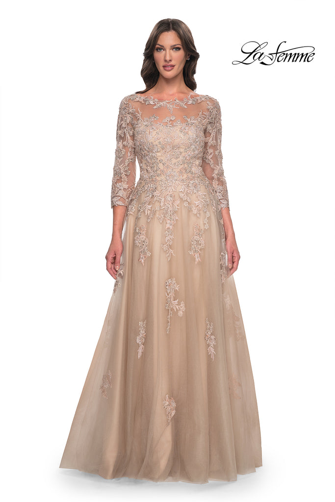 A-line tulle and lace applique gown with full skirt and illusion neckline. Three quarter sleeves with lace detail. Back zipper closure.