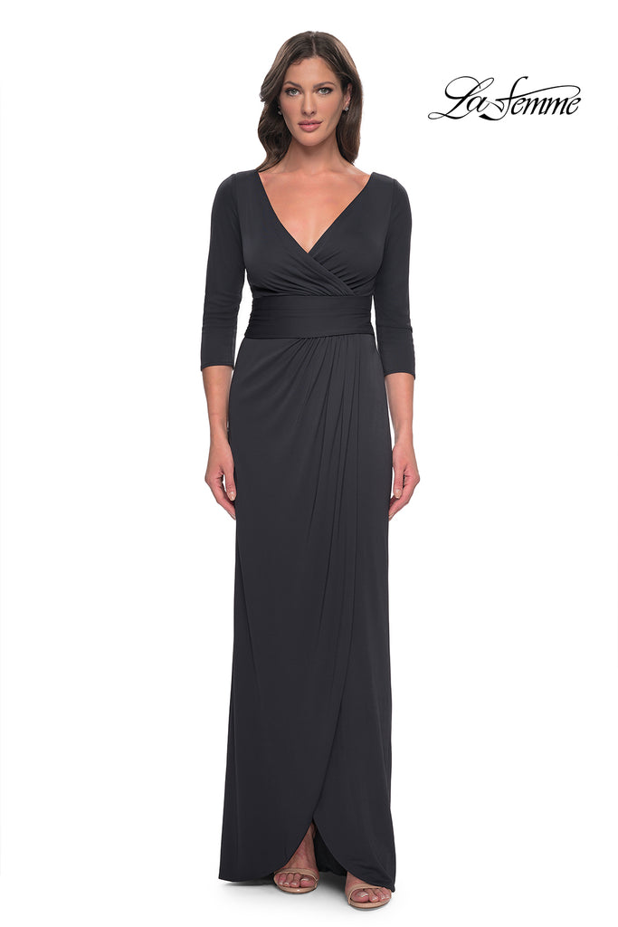 Long jersey evening dress with flattering ruching and tulip style skirt. Three quarter sleeves and V neckline. Back zipper closure.
