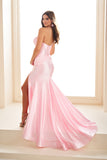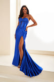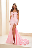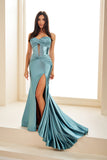Be the focal point of the night in Ellie Wilde Prom Style EW36045. The stretch knit fabric is accented with stones and features a corset bodice, slit, and stretch lining for a perfect fit. Make a statement and feel confident in this elegant and contemporary dress.