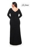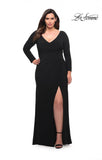 Long sleeve elegant plus size dress with V neckline and slit. Back zipper closure.