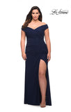 Off the shoulder plus size dress in net jersey fabric. Gorgeous ruching detail throughout to create the most flattering fit. Back zipper closure.