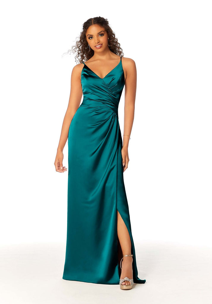 Radiant silky satin bridesmaid dress has a classic v-neckline and a draped surplice bodice that cinches in the waist on an elegant A-line silhouette with wrap skirt detail. Shown in Latte. View swatch card for all available colors.