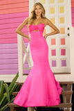 Turn heads in this stunning Sherri Hill strapless mermaid gown, designed to showcase your silhouette with precision. The fitted taffeta fabric drapes elegantly while the ruched neckline adds sophisticated texture and dimension. A chic keyhole cutout at the bodice creates an alluring focal point that balances coverage with glamour. Perfect for proms, galas, and unforgettable evenings, this gown combines timeless elegance with modern edge for a look that commands attention.