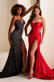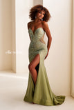 Turn heads at prom with the Ellie Wilde EW37008, a sparkling mermaid gown featuring a daring plunging V-neckline and a flattering natural waistline. Crafted from stretch knit fabric with stone accents, this long, strapless dress offers comfort and shimmer. The lace-up back ensures a perfect fit, while the subtle slit adds a touch of allure. Perfect for making a memorable entrance, this dress combines elegance and bold style effortlessly.