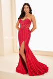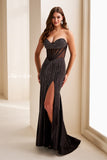 Turn heads at your next event in this stunning strapless mermaid gown. The sweetheart neckline and structured corset bodice create an hourglass silhouette, while the dramatic slit adds movement and allure. Shimmering stone embellishments catch the light against luxurious stretch knit fabric, ensuring you radiate elegance all night long. The lace-up back detail offers both visual interest and a customizable fit. Adjustable straps are included for versatile styling options. This show-stopping dress transforms any occasion into your moment to shine.