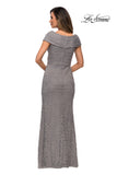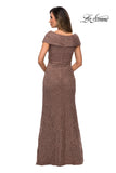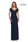 Modern off the shoulder cap sleeve lace evening gown featuring pleating and a faux wrap bodice. Back zipper closure.