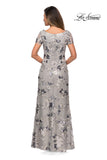 Modern floor length formal floral gown with sheer short sleeves and a flattering scoop neckline. Back zipper closure.