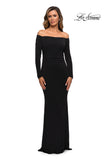 Simple and sleek floor length jersey gown with off the shoulder long sleeves. Back zipper closure.