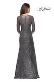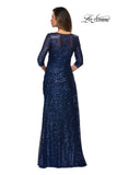 Beautiful floor length sequin evening dress with three quarter sleeves and a unique sweetheart neckline. Soft ruching makes this design flattering and easy to wear. Back zipper closure.