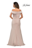 Lovely off the shoulder satin gown for the mother of the bride or groom. Features flattering ruching and a unique neckline. Back zipper closure.