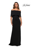 Long jersey evening gown with off the shoulder top and three-quarter sleeve. Back zipper closure.