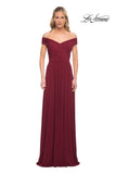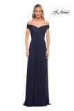Off the shoulder long jersey gown with ruching across bodice and V neckline. Back zipper closure.