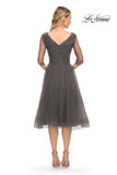 Knee length tulle and beaded gown with V neckline. Sheer three quarter sleeves and full skirt. Back zipper closure.