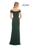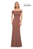 Off the shoulder jersey gown with ruching throughout. Back zipper closure.
