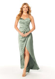 Gorgeous silky satin bridesmaid dres has a draped surplice bodice with a romantic sweetheart neckline with halter-style spaghetti straps and chic faux-wrap skirt with front slit. Shown in Spice and Moss. View swatch card for all availble colors.