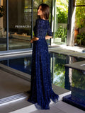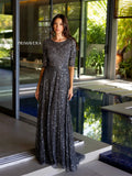 Chic beaded dress with high neckline and elbow length sleeves.