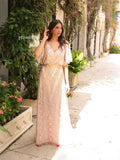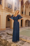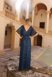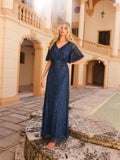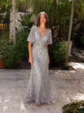 Chic beaded mothers dress with v neckline and short sleeves. Top showcases a beautiful blousing detail.