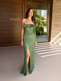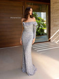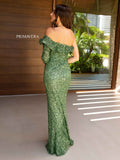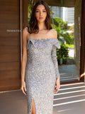 Chic beaded dress with off the shoulder ruffled detail and one full sleeve for a contemporary look.