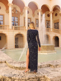 Chic beaded dress with V neckline and full length fitted sleeves and fully covered back.